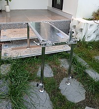 콤비좌대1600mm-2000mm사이즈 입니다. 정면 모습입니다. 하부쪽 모습입니다. 공용받침틀 장착 모습입니다. 자동다리 핸들장착 모습입니다. 중간연결부분 모습입니다. 다리보강바 장착모습 입니다.(옵션품목) 좌우 상…