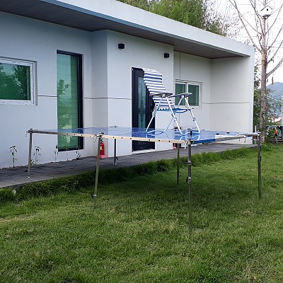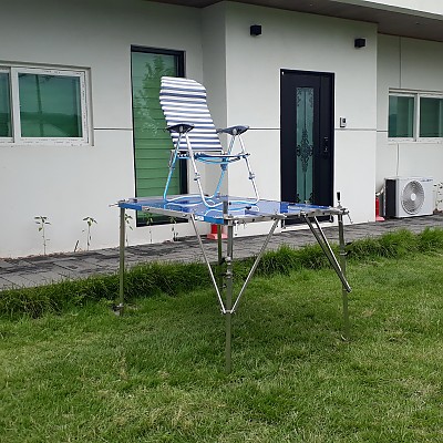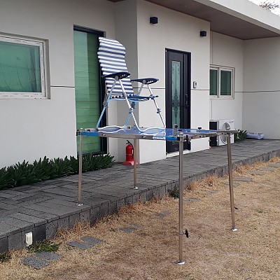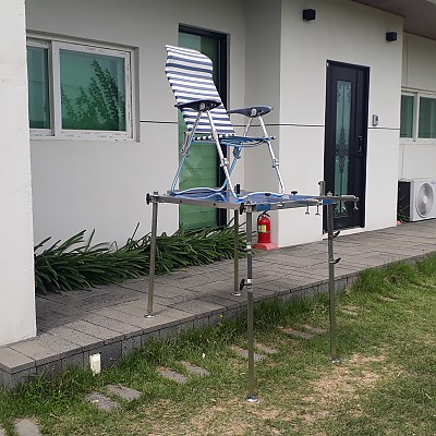 필피싱 콤비좌대 1200mm-1400mm사이즈 입니다. 정면 모습입니다. 하부쪽 모습입니다. 공용 받침틀 장착모습입니다. 자동다리 핸들장착 모습입니다. 다리보강바 설치 모습입니다.(옵션품목) 파라솔꽂이 장착모습입니다…