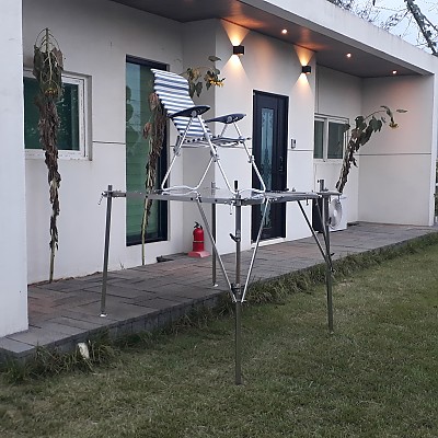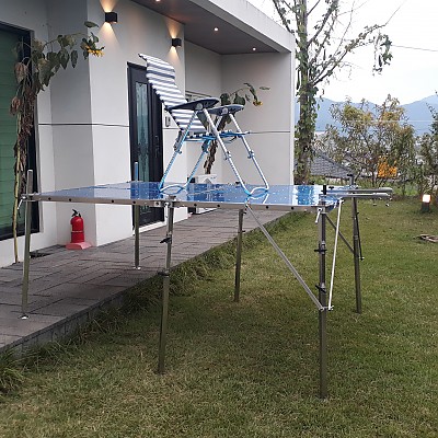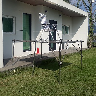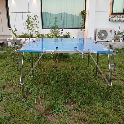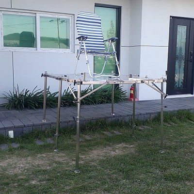 콤비좌대1600mm-2000mm사이즈 입니다. 정면 모습입니다. 하부쪽 모습입니다. 공용받침틀 장착 모습입니다. 자동다리 핸들장착 모습입니다. 중간연결부분 모습입니다. 다리보강바 장착모습 입니다.(옵션품목) 좌우 상…