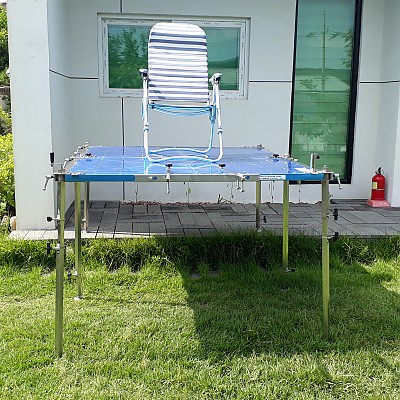 필피싱 콤비좌대 1800mm-2000mm사이즈 입니다. 측면 모습입니다. 하부쪽 모습입니다. 공용 받침틀 장착모습입니다. 파라솔 꽂이 장착모습입니다. 일반다리 장착 모습입니다. 뒤쪽에서 바라본 모습입니다. 중간 결합…